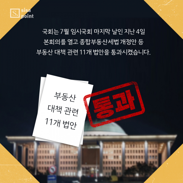 1. 국회는 7월 임시국회 마지막 날인 지난 4일 본회의를 열고 종합부동산세법 개정안 등 부동산 대책 관련 11개 법안을 통과시켰습니다.