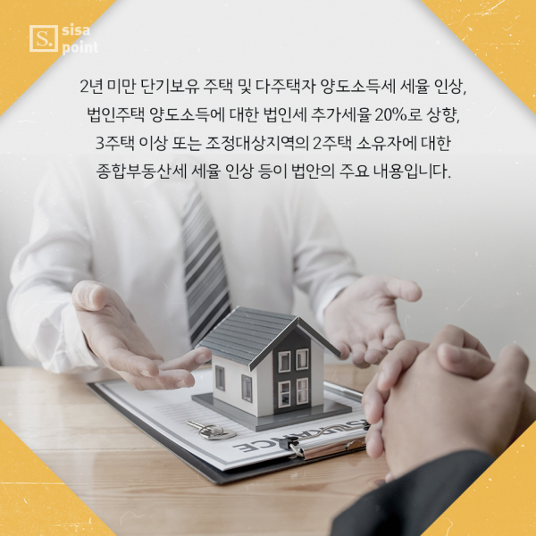 2. 2년 미만 단기보유 주택 및 다주택자 양도소득세 세율 인상, 법인주택 양도소득에 대한 법인세 추가세율 20%로 상향, 3주택 이상 또는 조정대상지역의 2주택 소유자에 대한 종합부동산세 세율 인상 등이 법안의 주요 내용입니다.