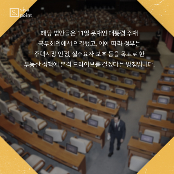 3. 해당 법안들은 11일 문재인 대통령 주재 국무회의에서 의결됐고, 이에 따라 정부는 주택시장 안정, 실수요자 보호 등을 목표로 한 부동산 정책에 본격 드라이브를 걸겠다는 방침입니다.