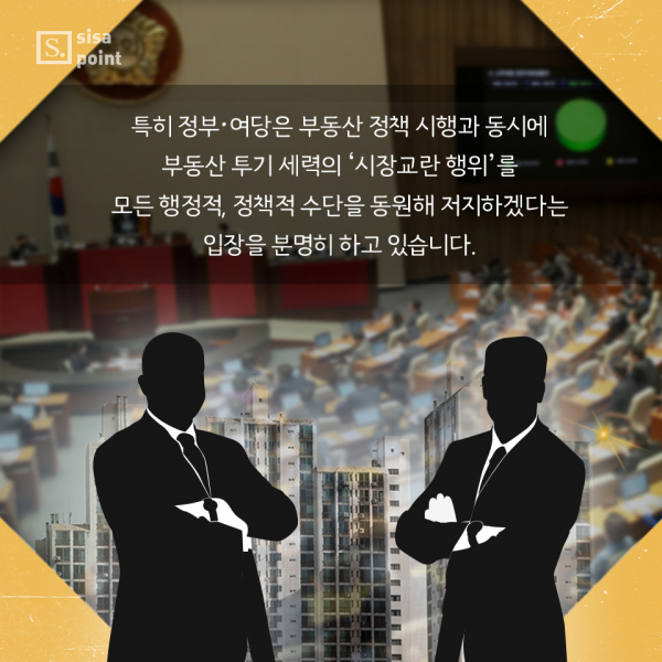 4. 특히 정부‧여당은 부동산 정책 시행과 동시에 부동산 투기 세력의 ‘시장교란 행위’를 모든 행정적, 정책적 수단을 동원해 저지하겠다는 입장을 분명히 하고 있습니다.