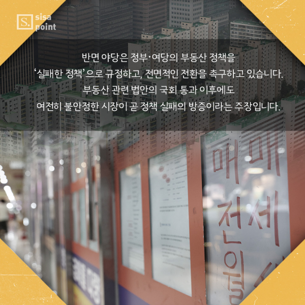 5. 반면 야당은 정부‧여당의 부동산 정책을 ‘실패한 정책’으로 규정하고, 전면적인 전환을 촉구하고 있습니다. 부동산 관련 법안의 국회 통과 이후에도 여전히 불안정한 시장이 곧 정책 실패의 방증이라는 주장입니다.