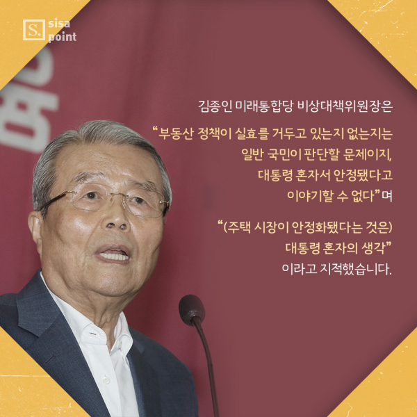 7. 김종인 미래통합당 비상대책위원장은 “부동산 정책이 실효를 거두고 있는지 없는지는 일반 국민이 판단할 문제이지, 대통령 혼자서 안정됐다고 이야기할 수 없다”며 “(주택 시장이 안정화됐다는 것은) 대통령 혼자의 생각”이라고 지적했습니다.