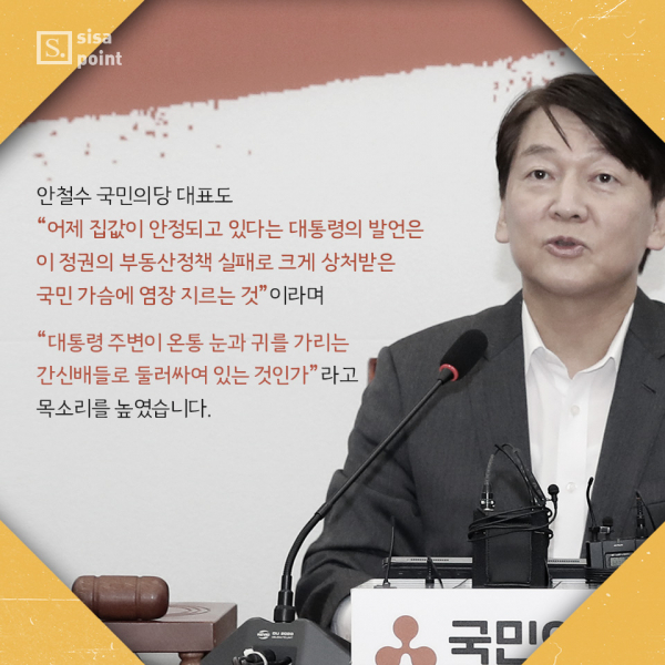 8. 안철수 국민의당 대표도 “어제 집값이 안정되고 있다는 대통령의 발언은 이 정권의 부동산정책 실패로 크게 상처받은 국민 가슴에 염장 지르는 것”이라며 “대통령 주변이 온통 눈과 귀를 가리는 간신배들로 둘러싸여 있는 것인가”라고 목소리를 높였습니다.