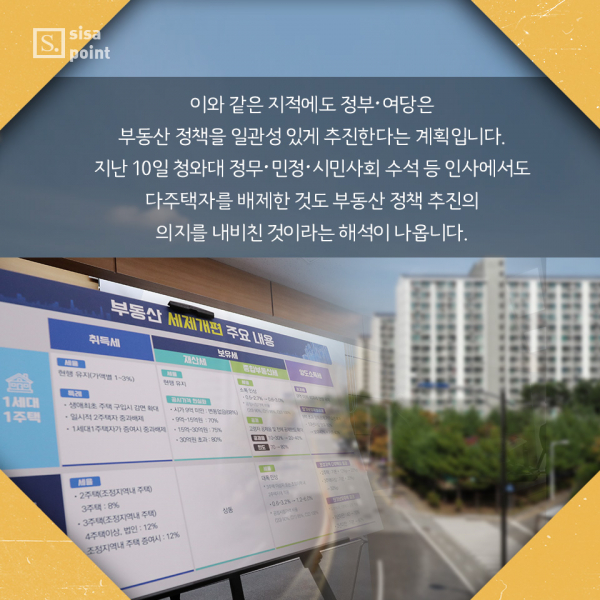 9. 이와 같은 지적에도 정부‧여당은 부동산 정책을 일관성 있게 추진한다는 계획입니다. 지난 10일 청와대 정무·민정·시민사회 수석 등 인사에서도 다주택자를 배제한 것도 부동산 정책 추진의 의지를 내비친 것이라는 해석이 나옵니다.