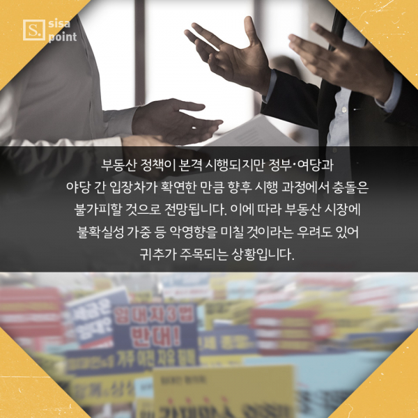 10. 부동산 정책이 본격 시행되지만 정부‧여당과 야당 간 입장차가 확연한 만큼 향후 시행 과정에서 충돌은 불가피할 것으로 전망됩니다. 이에 따라 시장에 불확실성 가중 등 악영향을 미칠 것이라는 우려도 있어 귀추가 주목되는 상황입니다.