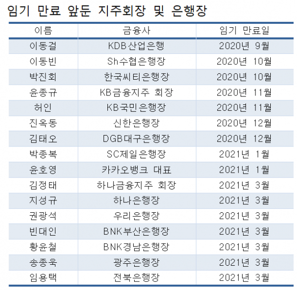 올해 하반기를 시작으로 내년 초까지 은행권 수장 16명의 임기가 만료된다. 관심이 집중되는 인물로는 이동걸 산업은행 회장, 윤종규 KB금융지주 회장의 연임 여부다. 또 업계에서는 일부 은행이 코로나19 위기에서 실적 방어에 실패하고 있어 교체될 가능성이 높다고 예상한다. 씨티은행의 박진회 행장이 올해 상반기 악화된 실적을 발표한 후 3연임을 포기한다고 밝힌 것도 실적과 무관하지 않다는 분석이다.