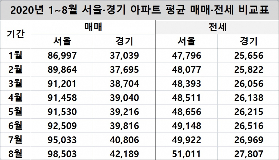 업계에선 서울에 아파트 구매 부담이 커지면서 경기권에서 ‘내 집 마련’에 나선 수요가 늘었는 분석이다. KB부동산 리브온이 발표한 월간 KB주택가격동향에 따르면 이달 서울의 아파트 평균 매매가는 9억8503만원을 기록했다. 지난해 말 8억5951만원과 비교해 반년 새 1억원 이상 오른 것이다. 서울 평균 전셋값은 5억1011만원으로 통계 작성을 시작한 이래 최고치를 기록했다. 반면 이달 경기도의 아파트 평균 매매가는 4억2189만원, 전셋값은 2억7807만원을 기록했다. 매매가의 경우 서울 평균 전셋값보다 낮은 수준이다.