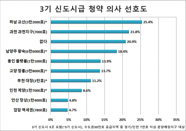 4일 직방이 직방 어플리케이션 내 접속자(1712명)를 대상으로 공급대책이 발표된 곳 중 청약 선호지역을 설문 조사한 결과에 따르면 청약 의사가 가장 높았던 곳은 ‘하남 교산(25.4%)’으로 나타났다. 이어 ▲과천 과천지구(21.8%) ▲남양주 왕숙(18.4%) 순으로 응답됐다.