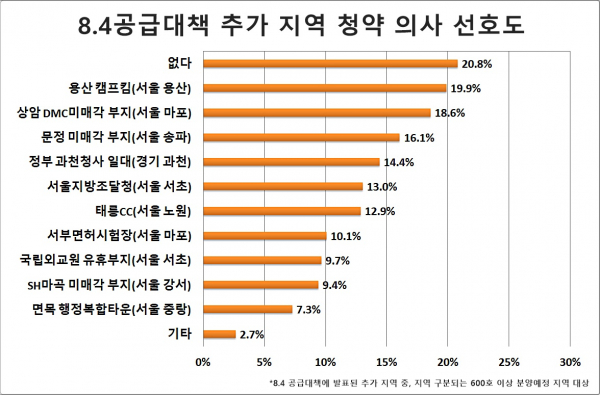 8.4 수도권 주택공급 대책에 추가 발표된 도심 내 군부지, 공공기관 이전, 유휴, 미매각 부지 등을 대상으로 청약 의사 선호 지역을 묻는 질문에는 청약 의사가 ‘없다’는 응답이 가장 많았다. ‘거주지 및 주 생활권과 무관해서’가 가장 큰 이유로 꼽혔다. ‘공개 지역 외에 다른 지역에 관심이 있어서’란 응답도 많았다.