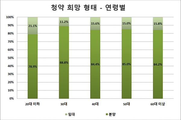 ‘청약을 신청한다면 어떤 형태를 희망하냐’는 질문에는 85.1%가 ‘분양’이라고 응답했고, 14.9%가 ‘임대’로 답했다. 20대가 다른 연령대에 비해 상대적으로 ‘임대’라고 응답한 비율이 높았다. 경제적인 여유가 상대적으로 낮아 나타난 결과로 풀이된다. 아파트 청약을 위해 현 거주지에서 청약 지역으로 이사(이주)를 고려하겠냐는 질문에는 62.9%가 ‘고려한다’고 응답했다. 연령별로는 거주의 이동이 상대적으로 자유로운 20대에서 다른 연령대에 비해 이주 의사가 높게 나타났다.