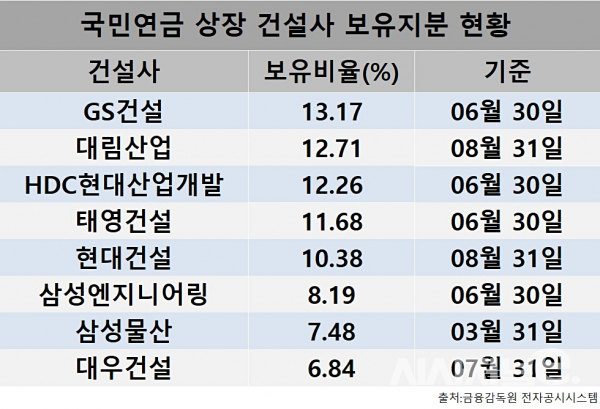 4일 금융감독원 전자공시시스템에 따르면 국민연금은 올해 들어 GS건설, HDC현대산업개발, 태영건설 등의 지분 비중을 높였다. 현재 국민연금이 소유한 GS건설의 지분은 2분기 기준 13.17%다. 이는 1분기 13.05%보다 0.12%포인트 확대된 것이다. 같은 기간 태영건설 지분율은 11.68%로 0.75%포인트 높아졌고, HDC현대산업개발 지분율은 12.26%로 11.79% 0.47%포인트 커졌다. 이 밖에 국민연금이 지분을 보유한 상장 건설사의 지분율은 현대건설 10.38% 대림산업 12.71%, 현대건설 10.38%, 삼성엔지니어링 8.19%, 삼성물산 7.48%, 대우건설 6.84%, 삼성엔지니어링 8.19, 삼성물산 7.48% 등 10% 안팎이다.