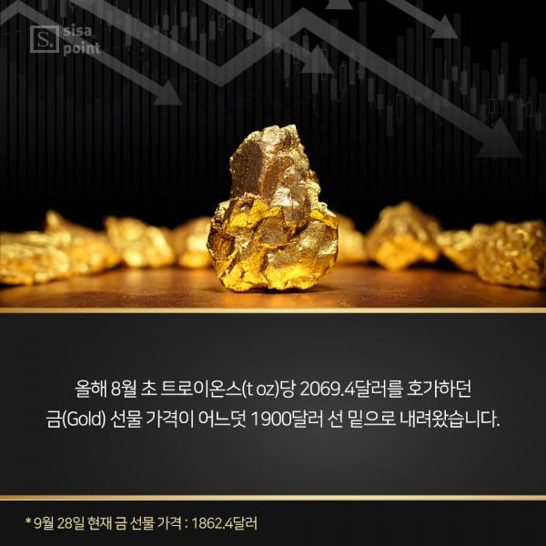 1. 올해 8월 초 트로이온스(t oz)당 2069.4달러를 호가하던 금(Gold) 선물 가격이 어느덧 1900달러 선 밑으로 내려왔습니다.