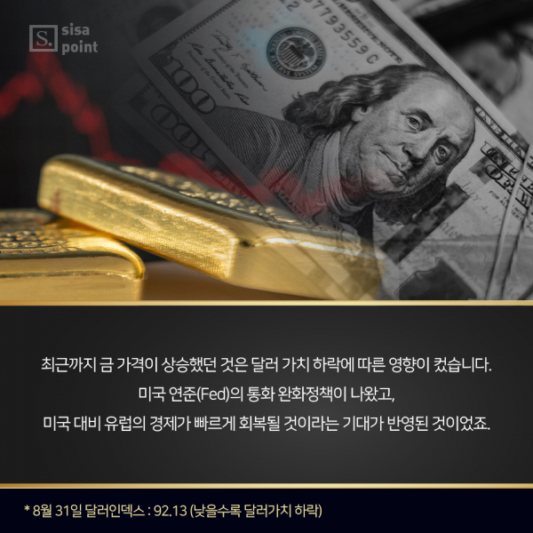 5. 최근까지 금 가격이 상승했던 것은 달러 가치 하락에 따른 영향이 컸습니다. 미국 연준(Fed)의 통화 완화정책이 나왔고, 미국 대비 유럽의 경제가 빠르게 회복될 것이라는 기대가 반영된 것이었죠.