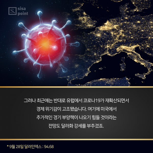 6. 그러나 최근에는 반대로 유럽에서 코로나19가 재확산되면서 경제 위기감이 고조됐습니다. 여기에 미국에서 추가적인 경기 부양책이 나오기 힘들 것이라는 전망도 달러화가 강세를 부추겼죠.