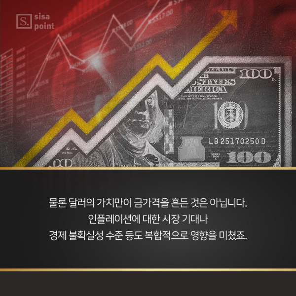 7. 물론 달러의 가치만이 금가격을 흔든 것은 아닙니다. 인플레이션에 대한 시장 기대나 경제 불확실성 수준 등도 복합적으로 영향을 미쳤죠.