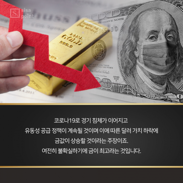 9. 코로나19로 경기 침체가 이어지고 유동성 공급 정책이 계속될 것이며 이에 따른 달러 가치 하락에 금값이 상승할 것이라는 주장이죠. 여전히 불확실하기에 금이 최고라는 것입니다.