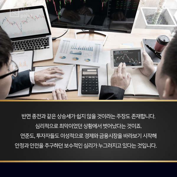 10. 반면 종전과 같은 상승세가 쉽지 않을 것이라는 주장도 존재합니다. 심리적으로 최악이었던 상황에서 벗어났다는 것이죠. 연준도, 투자자들도 이성적으로 경제와 금융시장을 바라보기 시작해 안정과 안전을 추구하던 보수적인 심리가 누그러지고 있다는 것입니다.
