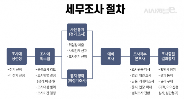 국세청 세무조사는 국세기본법과 조사사무처리규정에 따라 일정한 절차로 진행된다. 절차를 법으로 규정에 정해놓은 목적은 납세자의 법적 안정성과 예측 가능성을 보장하기 위함이다.