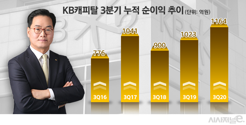 KB캐피탈 순이익을 3분기 누적 기준으로 보면, 2016년 3분기 776억원에서 2017년 3분기 1014억원, 2018년 3분기 900억원, 2019년 3분기 1023억원을 기록했다. 2020년 3분기에는 1164억원 기록해 지난 한 해 벌어들인 순이익(1194억원) 수준에 근접했다. KB금융에 인수된 후로 올해 연말 최대 실적이 예상된다.