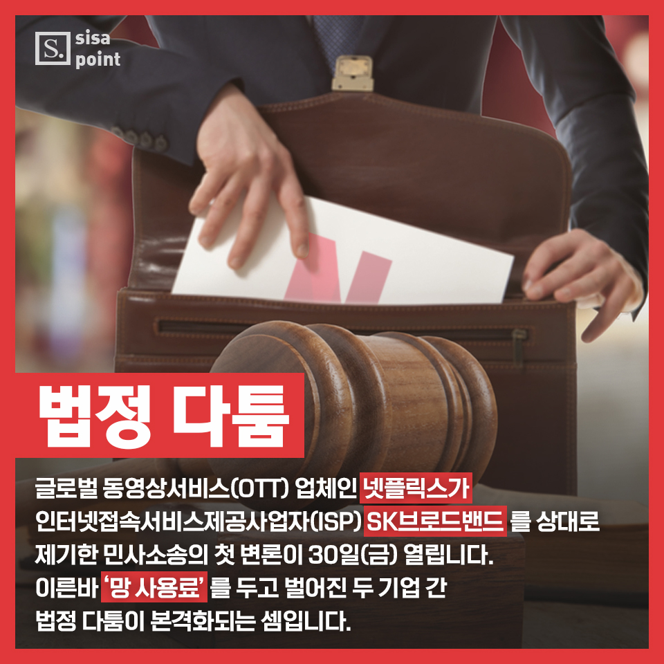 1. 글로벌 동영상서비스(OTT) 업체인 넷플릭스가 인터넷접속서비스제공사업자(ISP) SK브로드밴드를 상대로 제기한 민사소송의 첫 변론이 30일(금) 열립니다. 이른바 ‘망 사용료’를 두고 벌어진 두 기업 간 법정 다툼이 본격화되는 셈입니다.