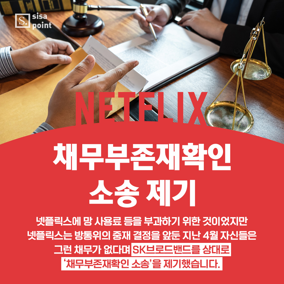 3. 넷플릭스에 망 사용료 등을 부과하기 위한 것이었지만 넷플릭스는 방통위의 중재 결정을 앞둔 지난 4월 자신들은 그런 채무가 없다며 SK브로드밴드를 상대로 ‘채무부존재확인 소송’을 제기했습니다.