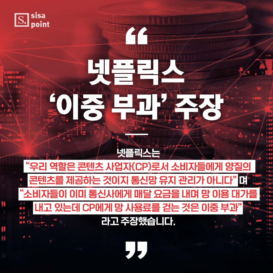 4. 넷플릭스는 “우리 역할은 콘텐츠 사업자(CP)로서 소비자들에게 양질의 콘텐츠를 제공하는 것이지 통신망 유지 관리가 아니다”며 “소비자들이 이미 통신사에게 매달 요금을 내며 망 이용 대가를 내고 있는데 CP에게 망 사용료를 걷는 것은 이중 부과”라고 주장했습니다.