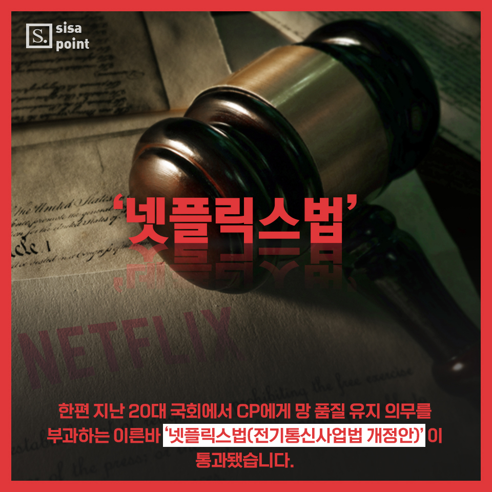 6. 한편 지난 20대 국회에서 CP에게 망 품질 유지 의무를 부과하는 이른바 ‘넷플릭스법(전기통신사업법 개정안)’이 통과됐습니다.