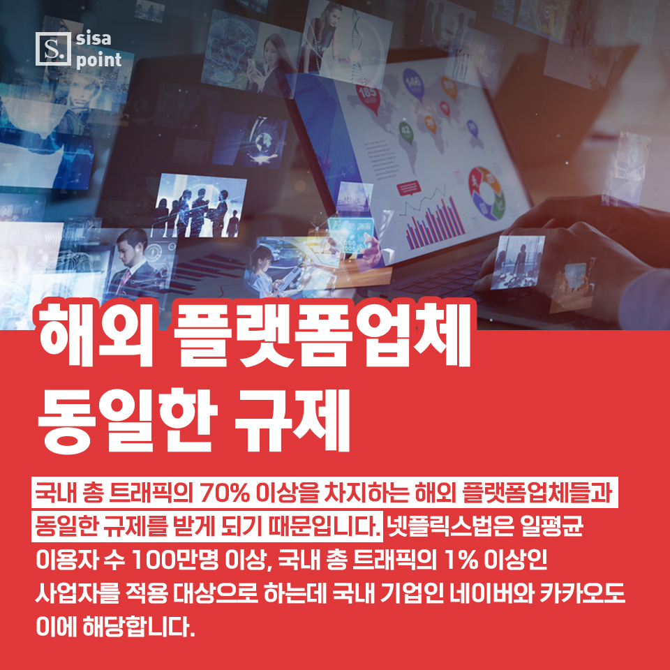 8. 국내 총 트래픽의 70% 이상을 차지하는 해외 플랫폼업체들과 동일한 규제를 받게 되기 때문입니다. 넷플릭스법은 일평균 이용자 수 100만명 이상, 국내 총 트래픽의 1% 이상인 사업자를 적용 대상으로 하는데 국내 기업인 네이버와 카카오도 이에 해당합니다.
