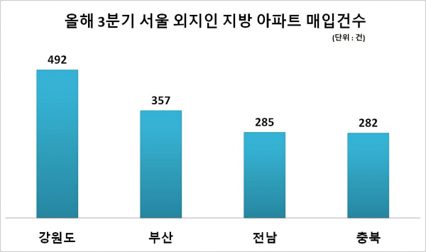 21일 한국감정원의 올해 3분기(7~9월) 아파트 거래 현황을 살펴보면 서울 거주자가 지방에서 아파트를 많이 매입한 지역은 강원도가 815건으로 가장 많았고, 충남 492건, 부산 357건, 전남 285건, 충북 282건 등의 순이었다.