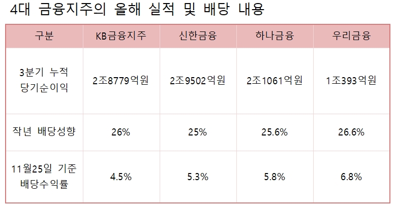 올해 4대 금융지주들이 3분기까지 호실적을 냈기 때문에 연말에 작년 이상의 순이익을 거둔다면 지난해와 비슷한 수준의 배당을 할 가능성이 높다. 4대 금융지주의 3분기 누적 순이익은 총 9조700억원으로 전년 같은 기간보다 15.1% 증가했다. 3분기 순이익이 9조원을 넘은 것은 지주사 설립 이래로 처음이다.