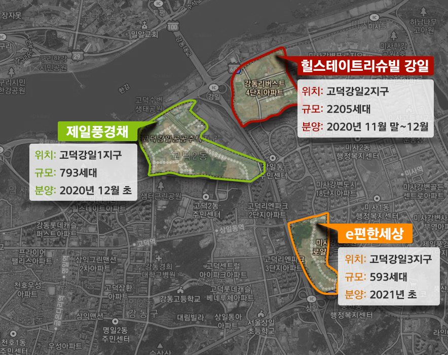 서울 강동구 강일동에 공급되는 힐스테이트 리슈빌 강일은 고덕강일지구 분양 삼총사 중 한 곳이다. 고덕강일지구에선 이달 고덕강일2지구 힐스테이트 리슈빌 강일을 시작으로 올해 말 1지구 ‘제일풍경채’와 내년 초 3지구 ‘e편한세상’이 분양될 예정이다.