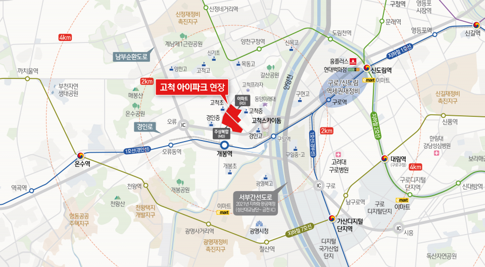 고척 아이파크는 대규모 주거시설뿐만 아니라 고척동 주민센터, 구로세무서 등이 입주하는 행정타운(계획)은 물론 공원, 쇼핑몰(예정) 등이 함께 조성되는 대규모 복합단지다. 국·공립어린이집이 계획돼 있다. 단지 인근으로 고척초등학교와 고척중, 경인중, 경인고등학교 등 초·중·고교가 도보권내에 위치했으며 반경 500m 거리에 서울 지하철 1호선 개봉역이 자리했다.