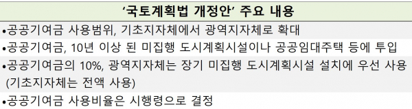 이밖에도 이번 개정안에선 기부채납 받는 현금은 10년 이상 된 미집행 도시계획시설이나 공공임대주택 등을 짓도록 규정했다. 광역지자체는 기부채납 받은 현금의 10%는 장기 미집행 도시계획시설 설치에 우선 사용하고 기초지자체는 전액을 쓰도록 했다. 강남 등지에서 진행되고 있는 대형 개발사업의 이익을 강북으로 돌려 도시계획시설 일몰제로 사라질 위기에 처한 도시공원을 조성하거나 서민 주거난을 해결하는 데 쓰이는 공공임대를 짓게 한다는 취지다.