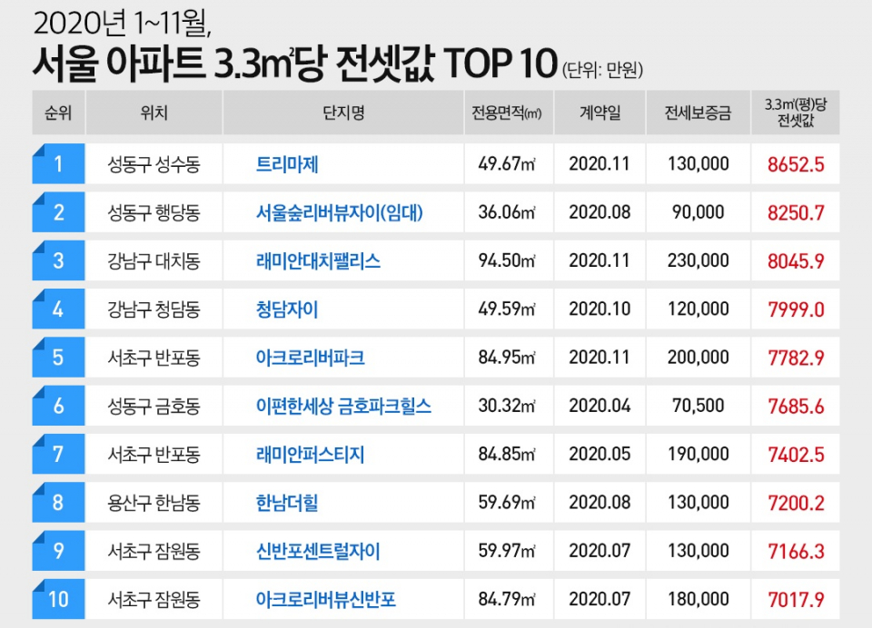 또 성동구 행당동에 위치한 ‘서울숲리버뷰자이’(임대) 전용 36.06㎡은 지난 8월 29일 9억원에 전세가 이뤄져 3.3㎡당 8250만원에 달했다. 강남구 대치동 ‘래미안대치팰리스’ 전용 94.50㎡도 23억원(3.3㎡당 8045.9만원)에 전세계약이 이뤄졌고 강남구 청담동 ‘청담자이’ 전용 49.59㎡가 지난 10월 12억원(3.3㎡당 7999만원), 서초구 반포동 ‘아크로리버파크’ 전용 84.95㎡은 20억원(7782.9만원)에 계약됐다.