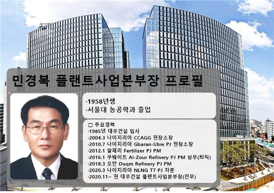 [시사저널e=길해성 기자] 대우건설이 연말 정기 임원인사에서 플랜트사업본부장(전무)으로 민경복 상무를 내정했다. 민 전무는 2016년 상무직 퇴직 이후 해외현장에서 자문역으로 일하다가 나이지리아 액화천연가스(LNG) 프로젝트의 성과를 인정받아 4년 만에 전무로 화려하게 복귀하게 됐다. 부진을 겪고 있는 대우건설의 플랜트사업을 일으킬 수 있을지 업계의 이목이 쏠린다.