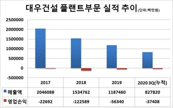 대우건설은 플랜트사업 회복이 절실한 상황이다. 플랜트 매출은 최근 5년간 뚜렷한 감소세를 나타내고 있다. 매출은 2016년 2조7917억원에서 지난해 1조6824억원까지 떨어졌다. 코로나19 여파로 올해는 더 심각하다. 3분기 누적 매출액이 8278억원에 그쳤다. 지난해 동기 대비 31% 가량 쪼그라든 것이다. 수익성 악화도 지속되고 있다. 올 3분기 374억원의 영업손실을 냈다. 2014년 258억원에서 적자 전환해 줄곧 마이너스 값을 기록하고 있다.