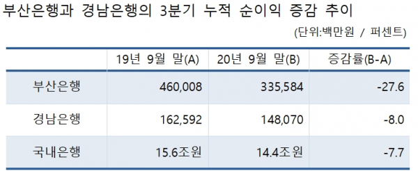 부산·경남銀 3분기 누적 순익···전년 동기 比 27%, 9%↓