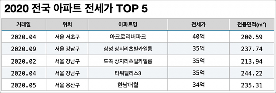 강남구 삼성 상지리츠빌카일룸(전용 237.74m²)과 강남구 도곡 상지리츠빌카일룸(전용 213.94m²), 강남구 타워팰리스3(전용 244.22m²) 3개 단지는 가 나란히 전세가 35억으로 그 뒤를 이었다. 용산구 한남더힐(전용면적 235.31m²)은 전세가 34억에 거래됐다.