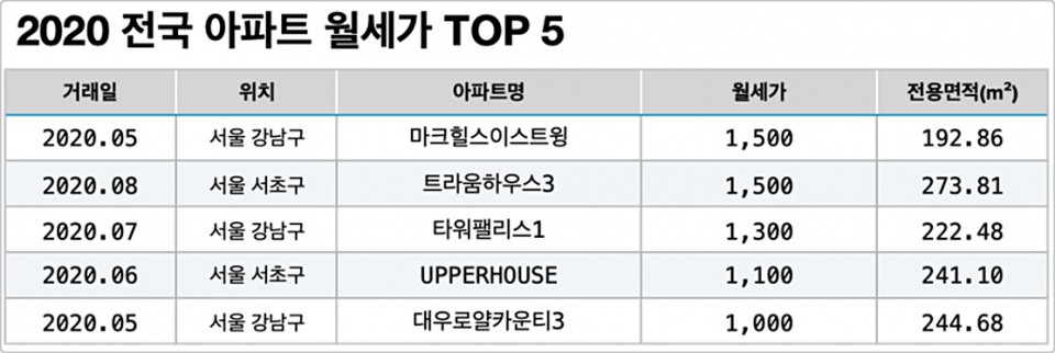 월세 1000만원 이상의 아파트 거래는 올해 총 10건이었다. 월 최고가 임대료 아파트는 강남구 마크힐스이스트윙(전용 192.86 m²)과 서초구 트라움하우스3(전용 273.81m²)으로, 월세가 1500만원에 달했다. 보증금은 각각 5억원, 2억원이다. 강남구 타워펠리스1(전용 222.48m²)이 보증금 3억원·월세 1300만원, 서초구 UPPERHOUSE(전용 241.1m²)가 보증금 1억원·월세 1100만원으로 뒤를 이었다.