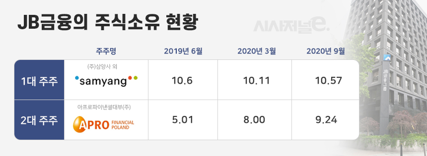 아프로파이낸셜대부는 작년 11월4일 JB금융 주식 244만2040주를 매입하면서 당시 2대 주주였던 국민연금보다 많은 주식수를 가지게 됐다. 지분율은 8.0%에서 9.24%로 높아졌다. 당시 최대주주인 삼양사의 지분율은 10.57%로 격차는 1.33%밖에 나지 않았다. 주식수 차이는 262만주 밖에 나지 않아 아프로파이낸셜대부가 다시 대규모 주식 매수에 나설 경우 최대주주가 뒤바꿀 수 있는 상황이었다.