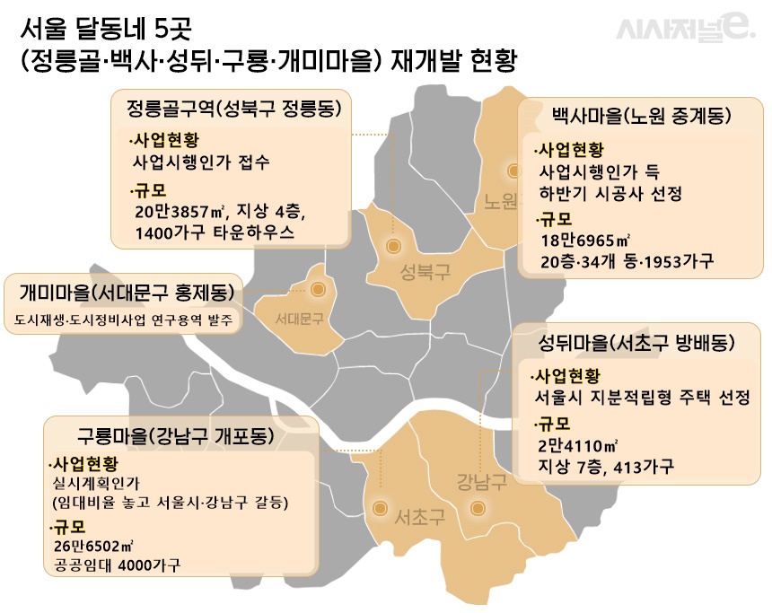 [시사저널e=길해성 기자] 서울의 마지막 남은 달동네들이 개발에 속도를 내고 있다. 중계동 ‘백사마을’은 최근 재개발사업의 7부 능선으로 불리는 사업시행인가를 통과했고, 방배동 ‘성뒤마을’도 서울시의 지분적립형 주택 1호 대상지로 꼽히며 개발이 본궤도에 올랐다. 정릉동 ‘정릉골’은 사업시행인가를 신청했고, 홍제동 ‘개미마을’은 최근 정비사업을 재추진하기 위한 용역을 발주했다. 그동안 낮은 사업성으로 지지부진했던 달동네 개발사업이 최근 정부의 주택공급 확대 방침과 맞물려 탄력이 붙은 모습이다.