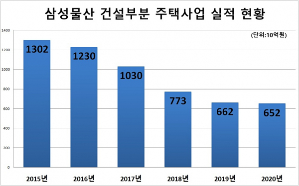 특히 같은 기간 주택사업의 수주잔고는 전년 대비 15.6% 줄어든 6조5262억원에 그쳤다. 이는 건설·상사·패션·리조트 등 각 사업부문이 통합된 현재의 삼성물산이 출범한 2015년 이후 가장 낮은 수치다. 주택사업 수주잔고는 2015년까지 연간 13조원 수준을 유지하다 2016년 말부터 12조원대로 떨어지더니 2017년 10조원대로 급감했다. 이후 ▲2018년 7조7351억원 ▲2019년 6조6290억원 ▲2020년 6조5262억원 등으로 꾸준히 줄고 있는 실정이다.