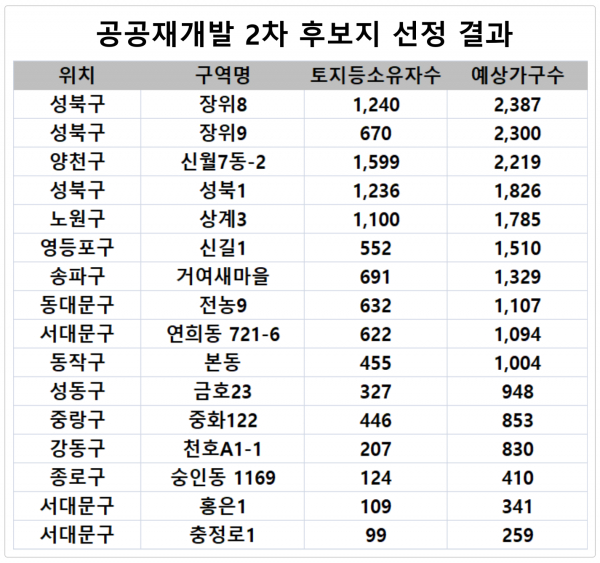 30일 건설업계에 따르면 국토교통부와 서울시는 전일 오후 10시 30분 서울 공공재개발 2차 후보지 선정 결과를 발표했다. 공공재개발 후보지는 ▲성북구 장위8·9(예상 가구 수 2387·2300가구) ▲양천구 신월7동-2(2219) ▲노원구 상계3동(1785가구) ▲송파구 거여새마을(1329가구) 등 16곳이다. 이는 앞서 발표된 1차 공공재개발 후보지 8곳보다 2배 가까이 늘어난 규모다. LH는 다음 달부터 사업설명회를 개최해 주민으로부터 공공시행자 지정 동의를 얻는다는 계획이다.
