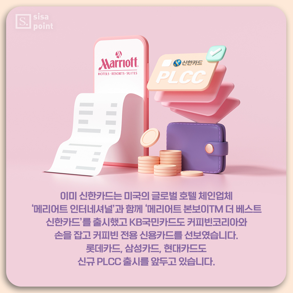 5. 이미 신한카드는 미국의 글로벌 호텔 체인업체 ‘메리어트 인터네셔널’과 함께 ‘메리어트 본보이TM 더 베스트 신한카드’를 출시했고 KB국민카드도 커피빈코리아와 손을 잡고 커피빈 전용 신용카드를 선보였습니다. 롯데카드, 삼성카드, 현대카드도 신규 PLCC 출시를 앞두고 있습니다.