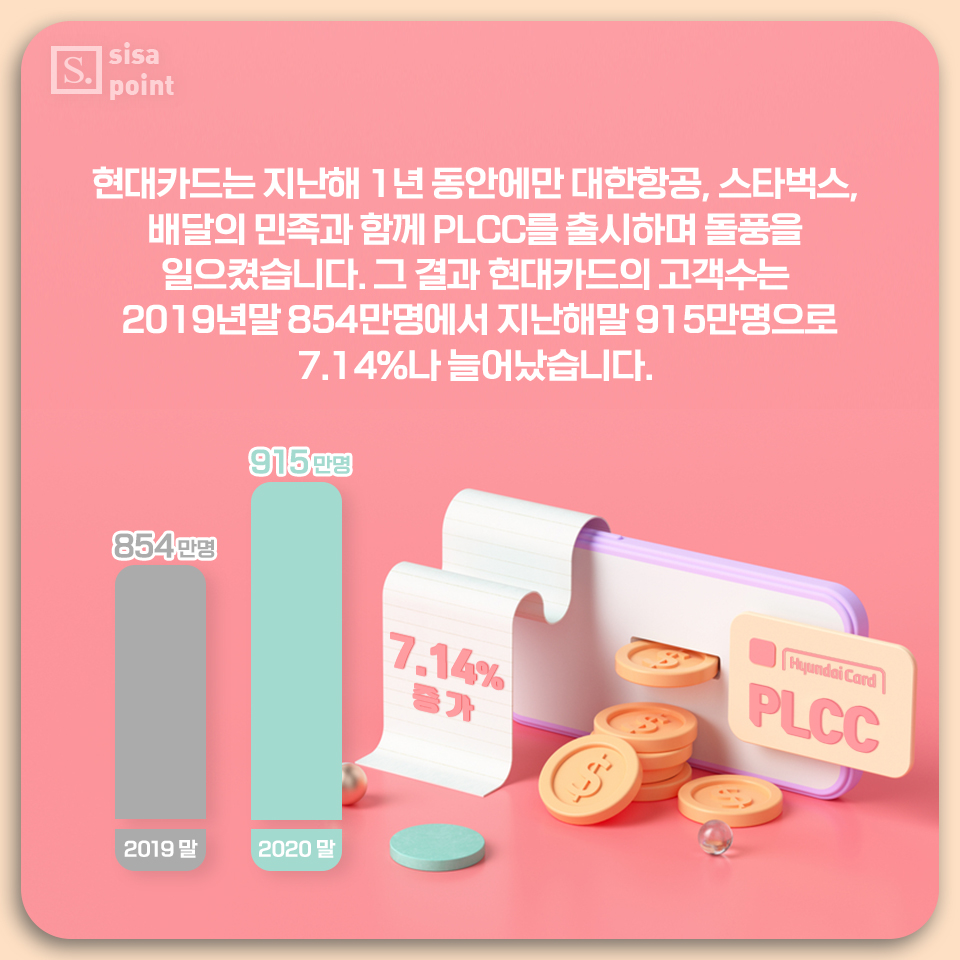 7. 현대카드는 지난해 1년 동안에만 대한항공, 스타벅스, 배달의 민족과 함께 PLCC를 출시하며 돌풍을 일으켰습니다. 그 결과 현대카드의 고객수는 2019년말 854만명에서 지난해말 915만명으로 7.14%나 늘어났습니다.