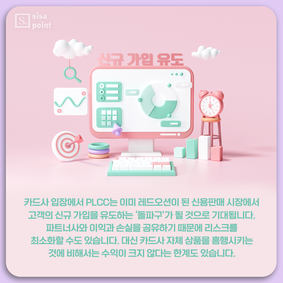 8. 카드사 입장에서 PLCC는 이미 레드오션이 된 신용판매 시장에서 고객의 신규 가입을 유도하는 ‘돌파구’가 될 것으로 기대됩니다. 파트너사와 이익과 손실을 공유하기 때문에 리스크를 최소화할 수도 있습니다. 대신 카드사 자체 상품을 흥행시키는 것에 비해서는 수익이 크지 않다는 한계도 있습니다.