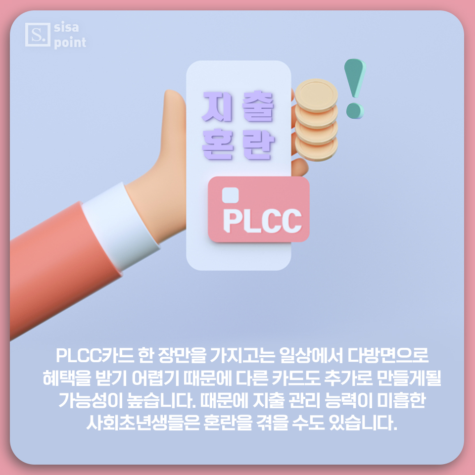 10. PLCC카드 한 장만을 가지고는 일상에서 다방면으로 혜택을 받기 어렵기 때문에 다른 카드도 추가로 만들게될 가능성이 높습니다. 때문에 지출 관리 능력이 미흡한 사회초년생들은 혼란을 겪을 수도 있습니다.
