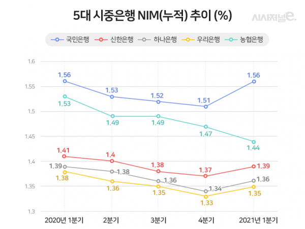 3일 금융권에 따르면 농협은행의 올해 1분기 누적 NIM(카드제외)은 1.44%로 지난해 4분기와 비교해 0.03%포인트(p) 하락했다. 5대 시중은행 가운데 유일하게 반등에 실패했다. 나머지 은행들의 NIM은 그간 저금리 기조로 인한 하락세를 딛고 일제히 오름세를 기록했다. 국민은행은 1분기 누적 NIM이 1.56%로 직전 분기 대비 0.05%p올라 가장 큰 상승폭을 보였다. 이어 신한은행(1.39%), 하나은행(1.36%), 우리은행(1.35%)이 각각 0.02%p 상승했다.