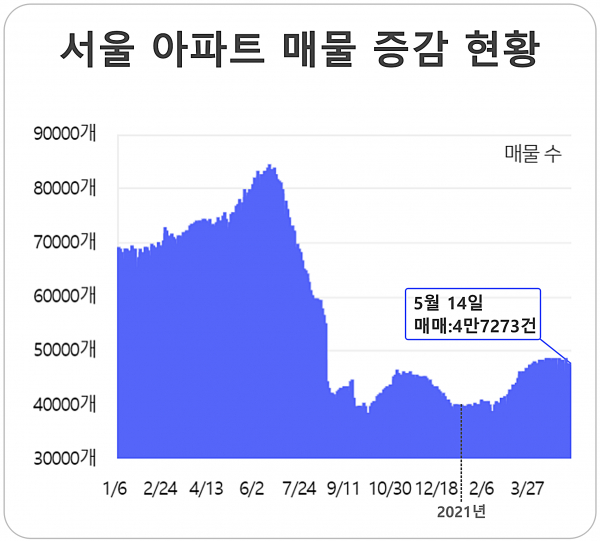 15일 부동산 빅데이터업체 아실에 따르면 서울 아파트 매물은 14일 기준 4만7273건이다. 전년 동기 7만4104건 대비 37% 가량 줄었다. 매물은 지난해 6월 8만건으로 정점을 찍고 점차 줄더니 8월부터 4만건대로 내려앉았다. 올해 2월 말부터 보유세 기산일인 6월 1일 전에 아파트를 처분하려는 다주택자들이 늘면서 4만7000건까지 올라갔지만 정부의 기대에는 못 미치는 수준이다.