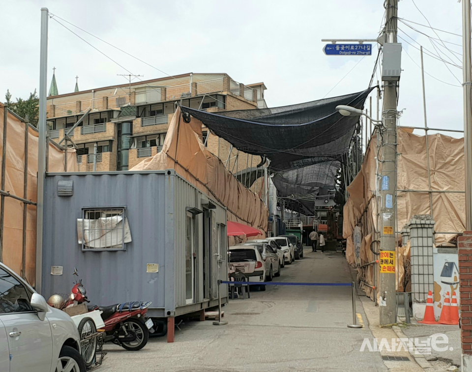 26일 찾은 장위10구역 내 사랑제일교회 주변은 경비가 삼엄한 모습이었다. 교회 정문으로부터 100m 떨어진 곳에선 신도 2명이 폴리스 라인을 치고 외부인 출입을 통제했다. 신원이 확인된 교인들만 교회 안으로 들어갈 수 있었다. 멀리 보이는 정문 철문 옆 진입로에는 굴삭기가 놓여 차량 출입도 쉽지 않아 보였다.